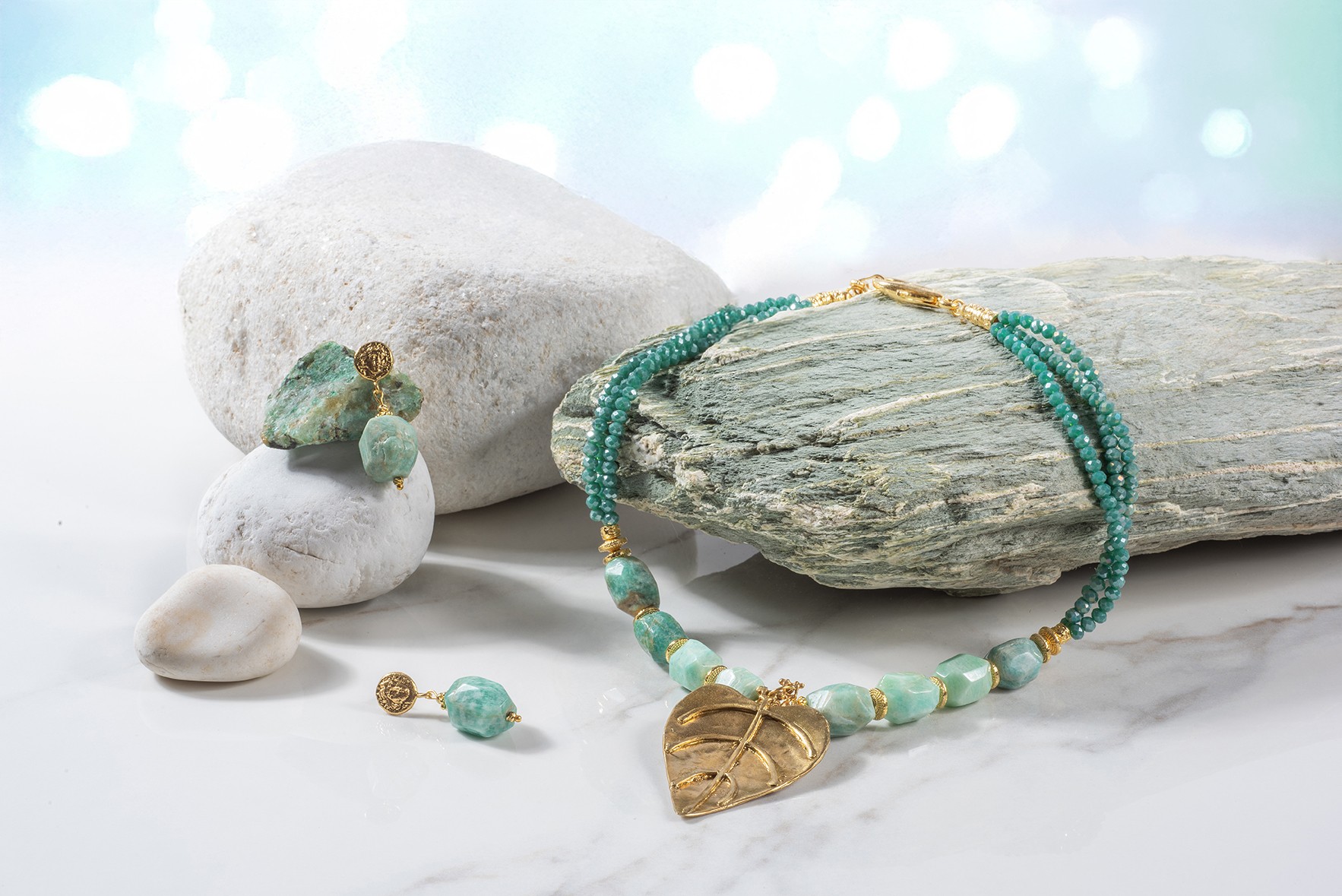 Doğal amazonit taşı ve parıltılı kristallerin birleşimiyle tasarlanan bu kolye, altın renkli yaprak ucu ile doğanın zarafetini yansıtır. Amazonit; huzur, denge ve iletişim taşı olarak bilinir. Şıklığınızı tamamlayan bu özel tasarım, uyumlu küpeleriyle birlikte sunulur.