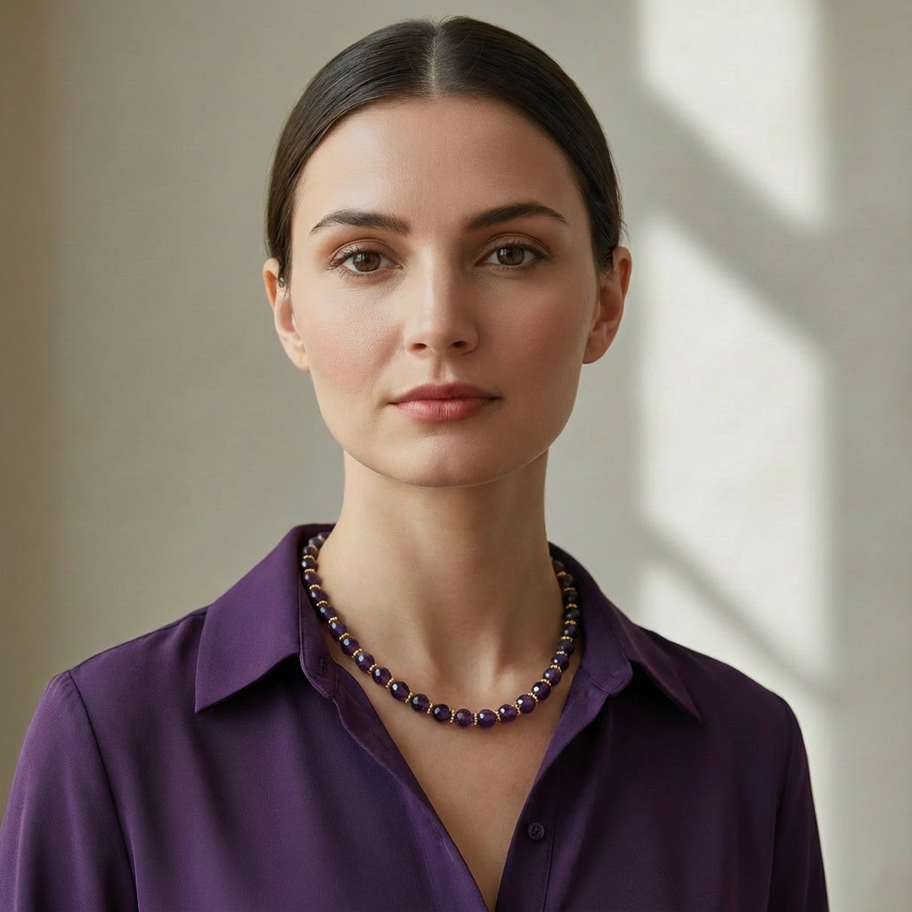 Ametist kolye, gündüz soft tonlu kombinlerle sade bir zarafet sunarken,