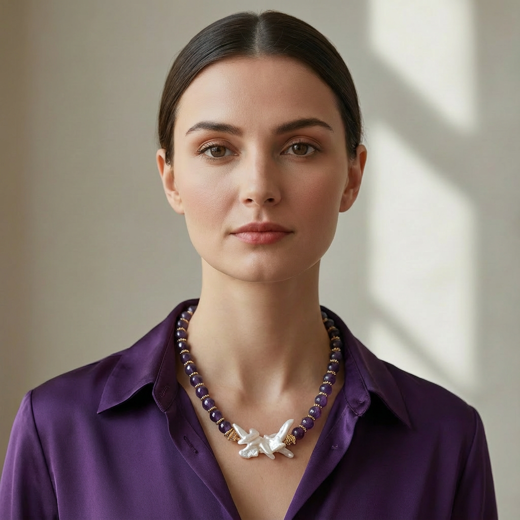 Bu özel tasarım, ametistin mor tonlu ruhsal berraklığını gerçek incinin doğal zarafetiyle bir araya getirir.