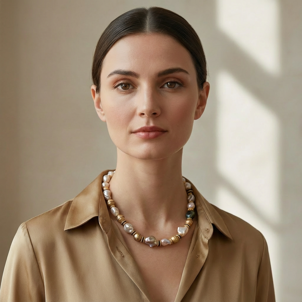 Labradoritin ışıkla canlanan enerjisi ile barok incinin saf zarafeti birleşerek güçlü ama sakin bir merkezlenme alanı oluşturur.