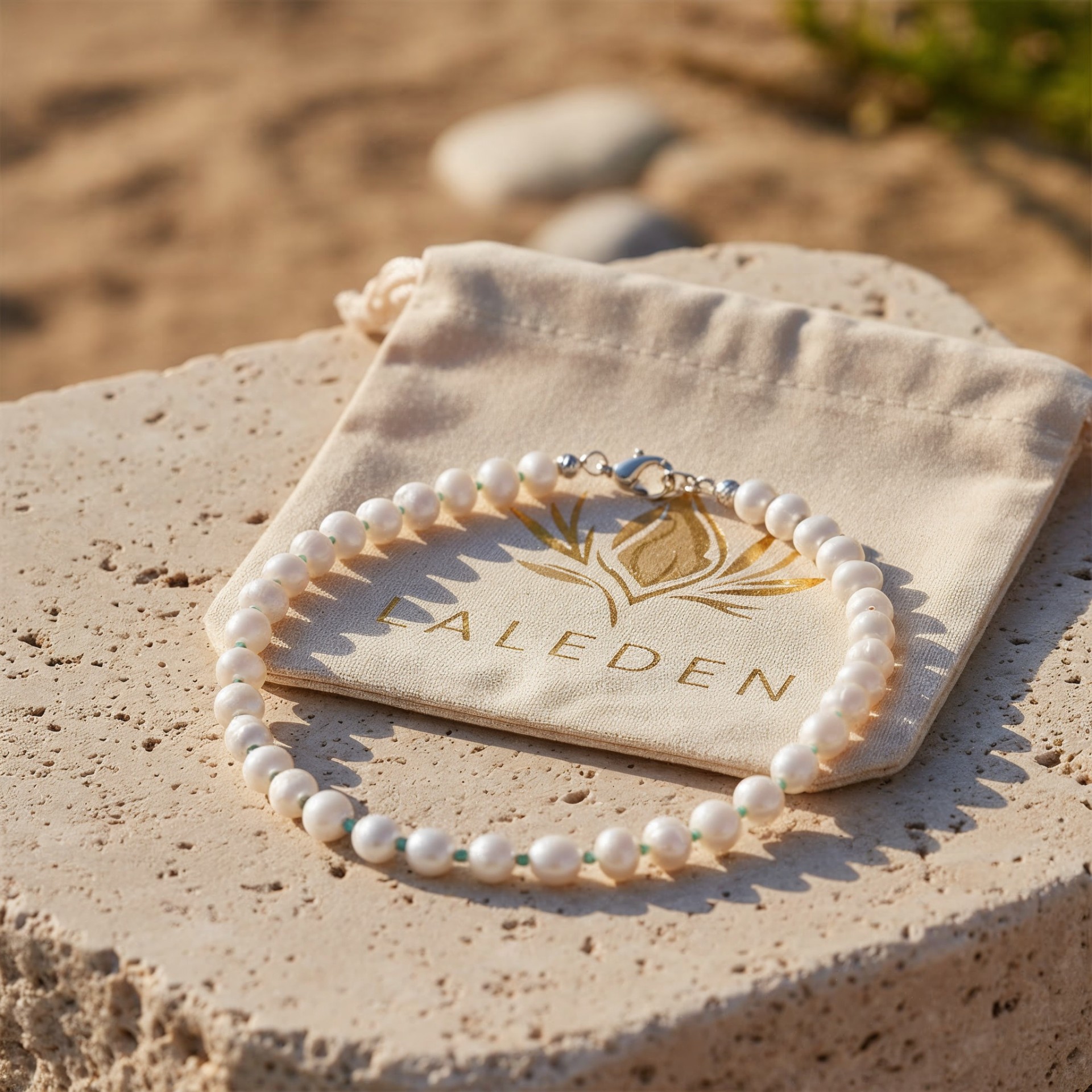 Bu özel tasarım, A+ kalite gerçek incilerin pürüzsüz parlaklığını turkuaz taşlarının canlı enerjisiyle bir araya getirir.