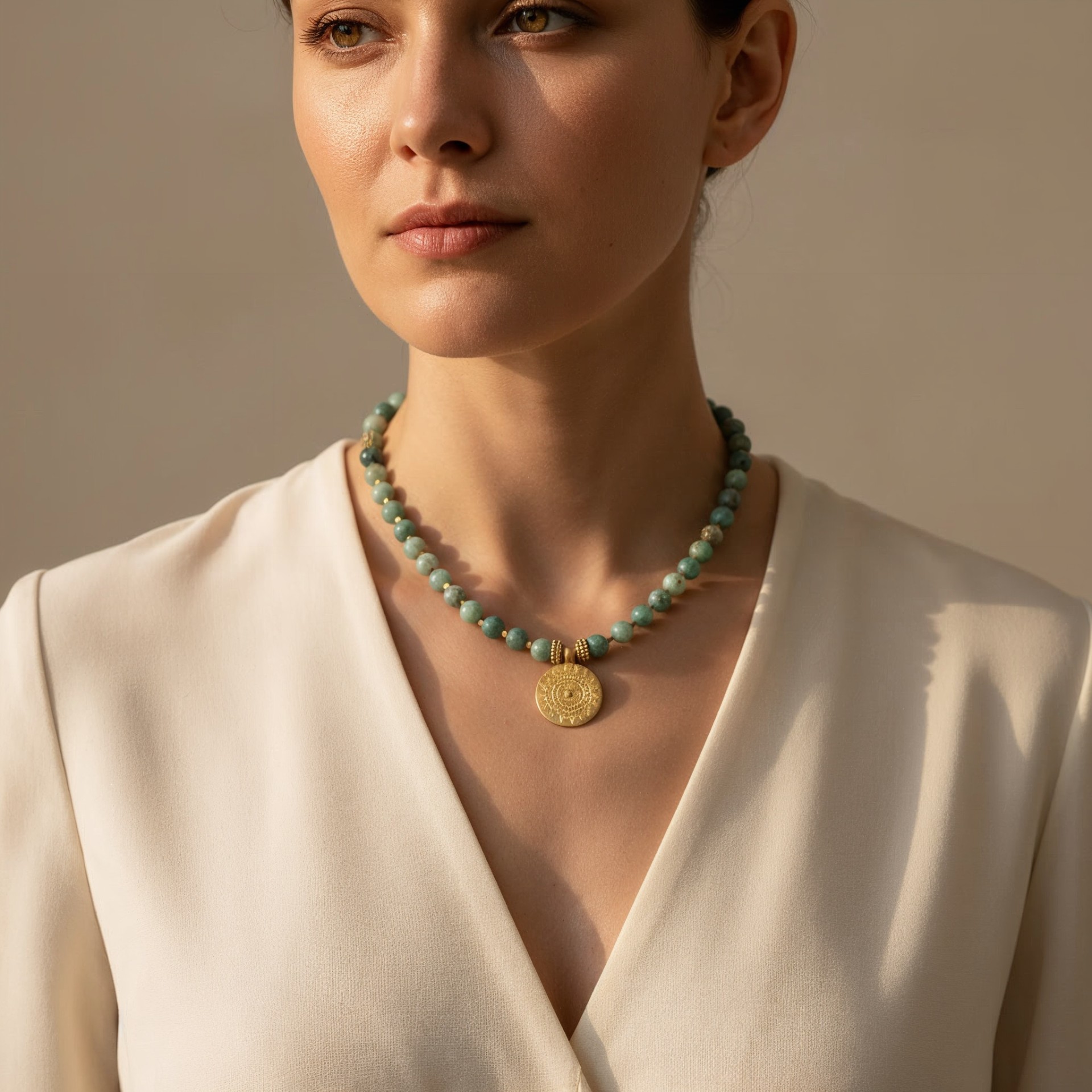 Bu özel tasarım, amazonitin deniz köpüğü tonlarındaki sakinleştirici enerjisini altın kaplama güneş mandala detayıyla bir araya getirir.
