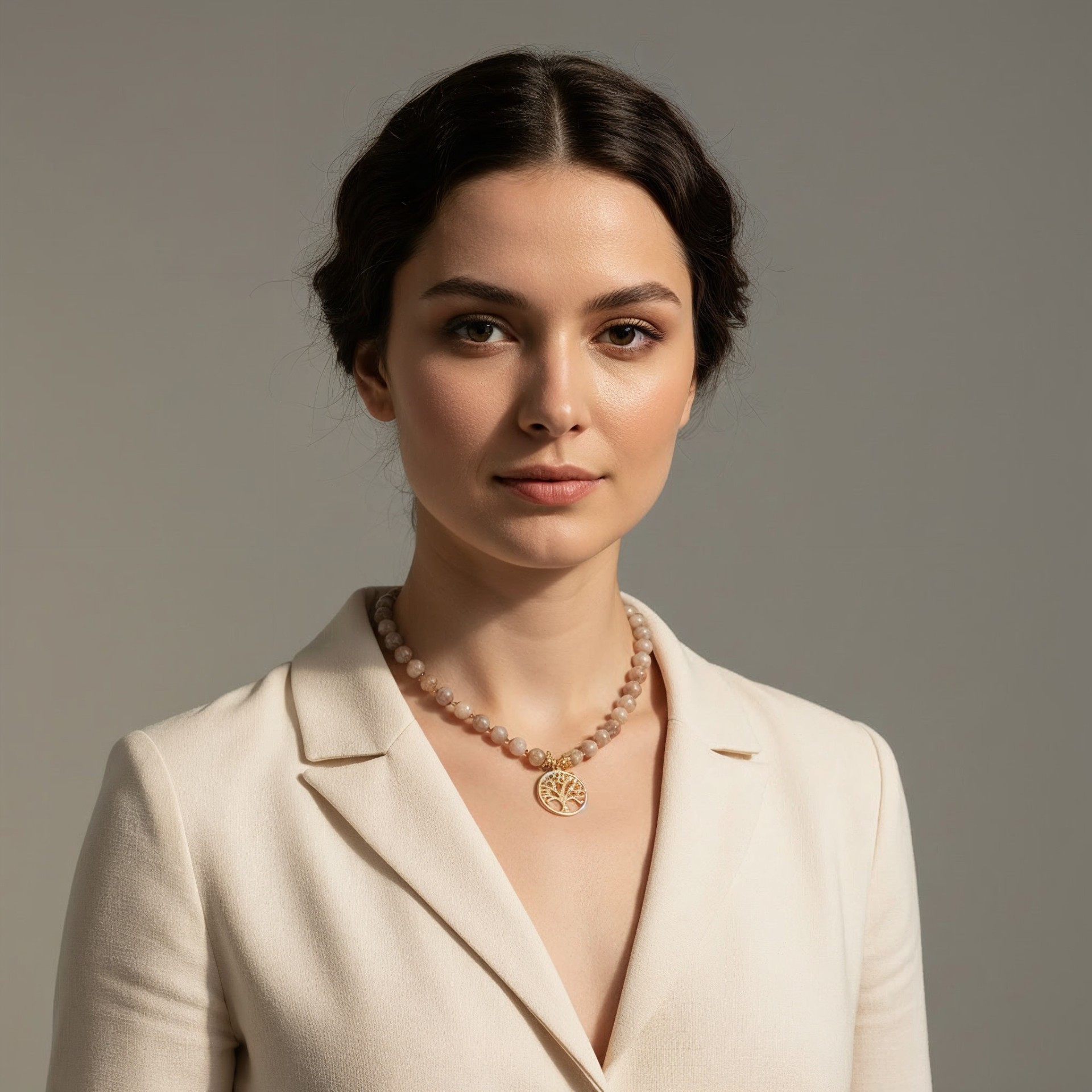 Taşın yumuşak ışığı ve Hayat Ağacı'nın köklenen enerjisi, kolyeye hem huzurlu hem de derin bir ruh katar.