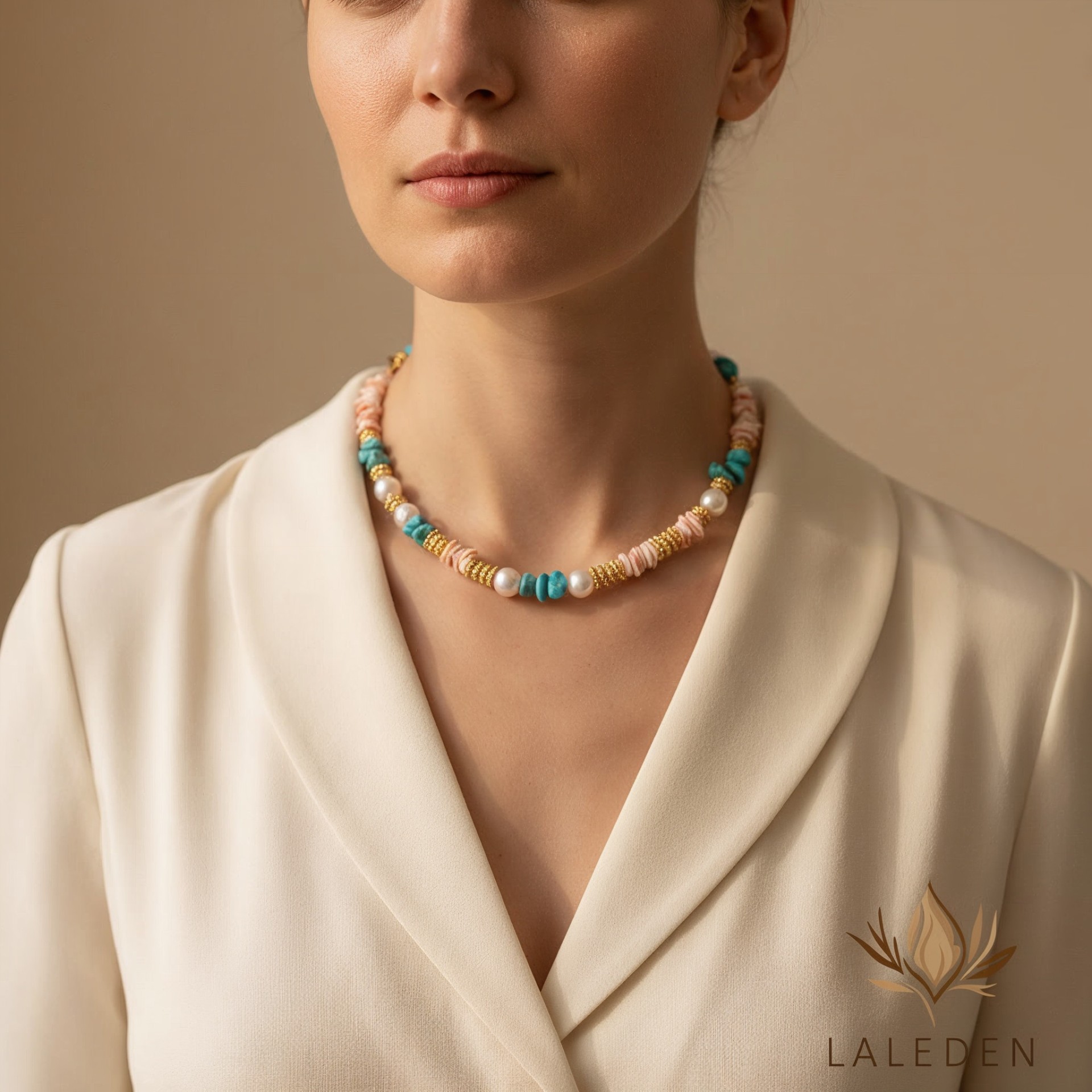 Bu zarif tasarım, doğal sedef taşlarının yumuşak parlaklığını, turkuazın canlı mavi enerjisini ve hakiki incinin saf ışığını bir araya getirir.