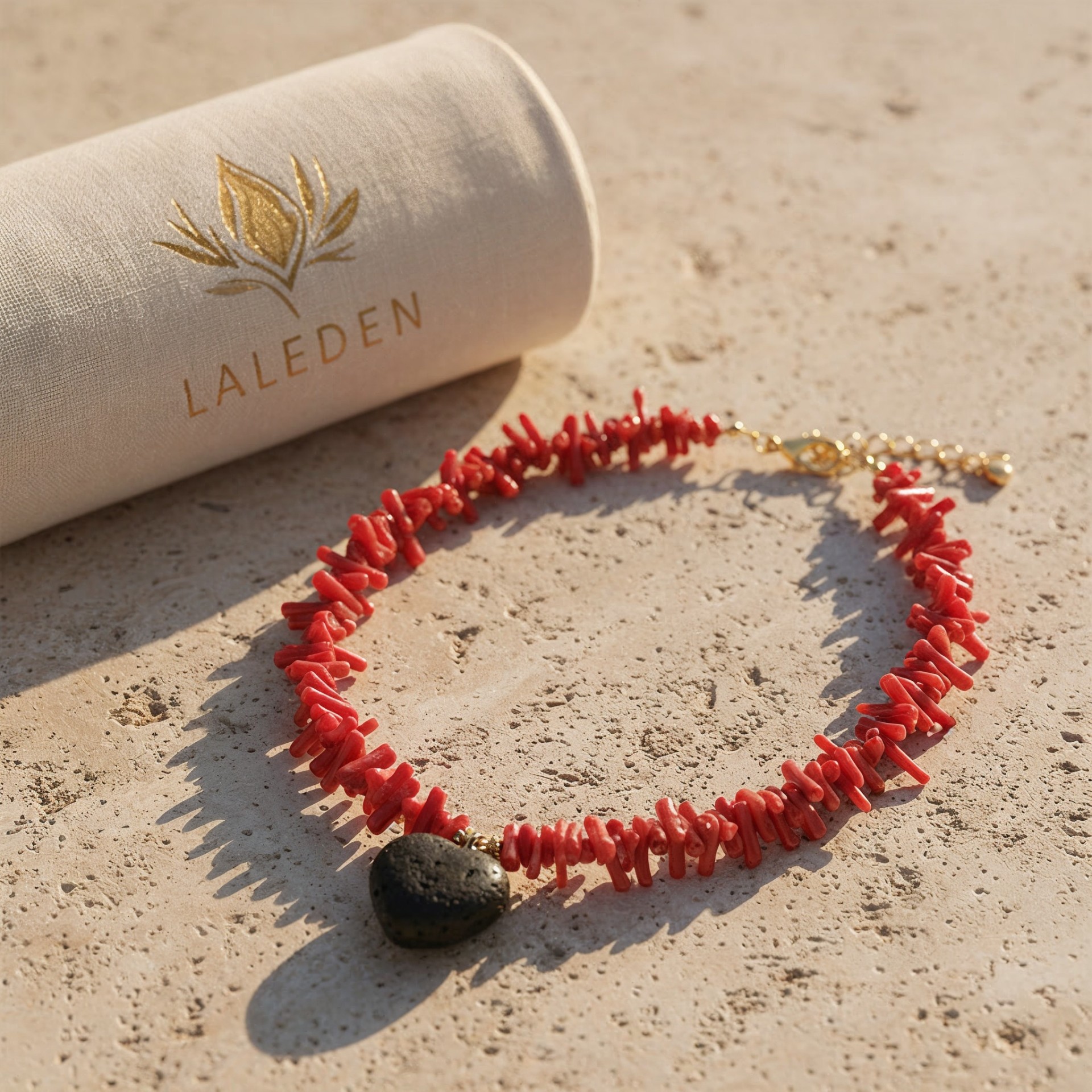 Bu özel tasarım, kırmızı mercanın canlı enerjisini lav taşının topraklayıcı gücüyle bir araya getirir.