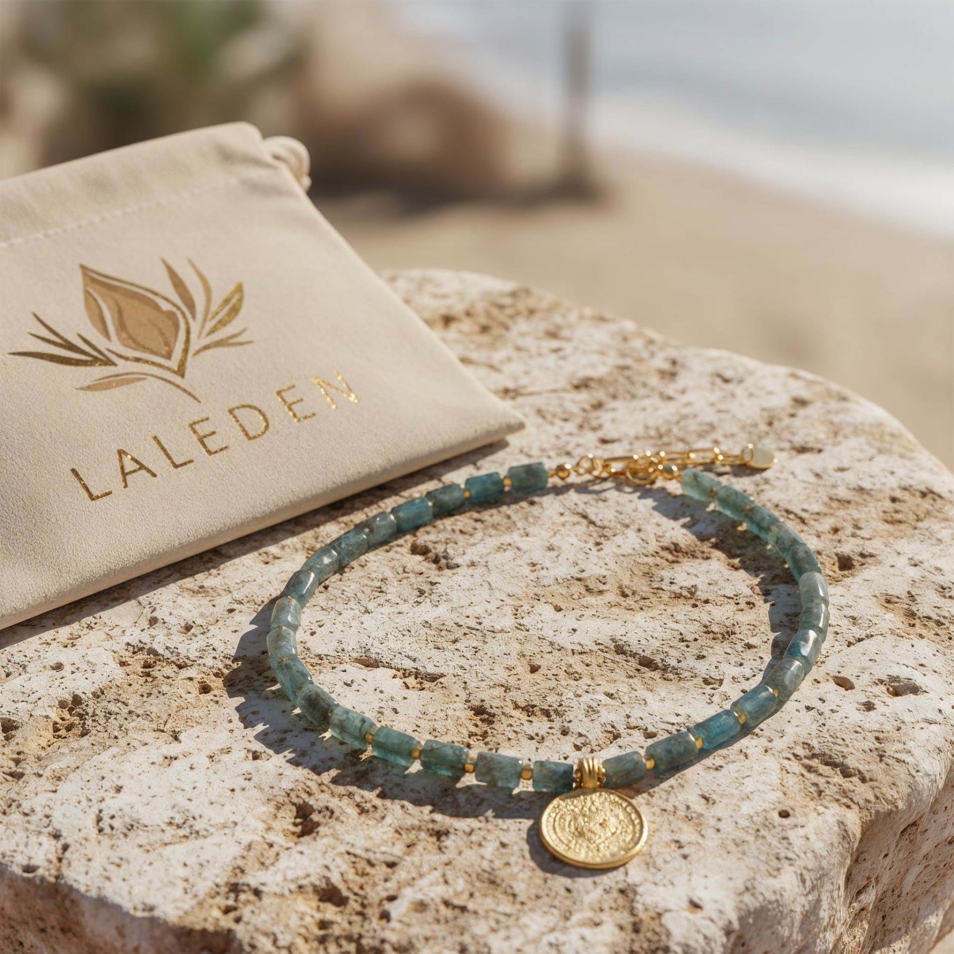 Apatitin serin tonları altın dokunuşlarla birleşerek modern, hafif ve spiritüel bir şıklık sunar.