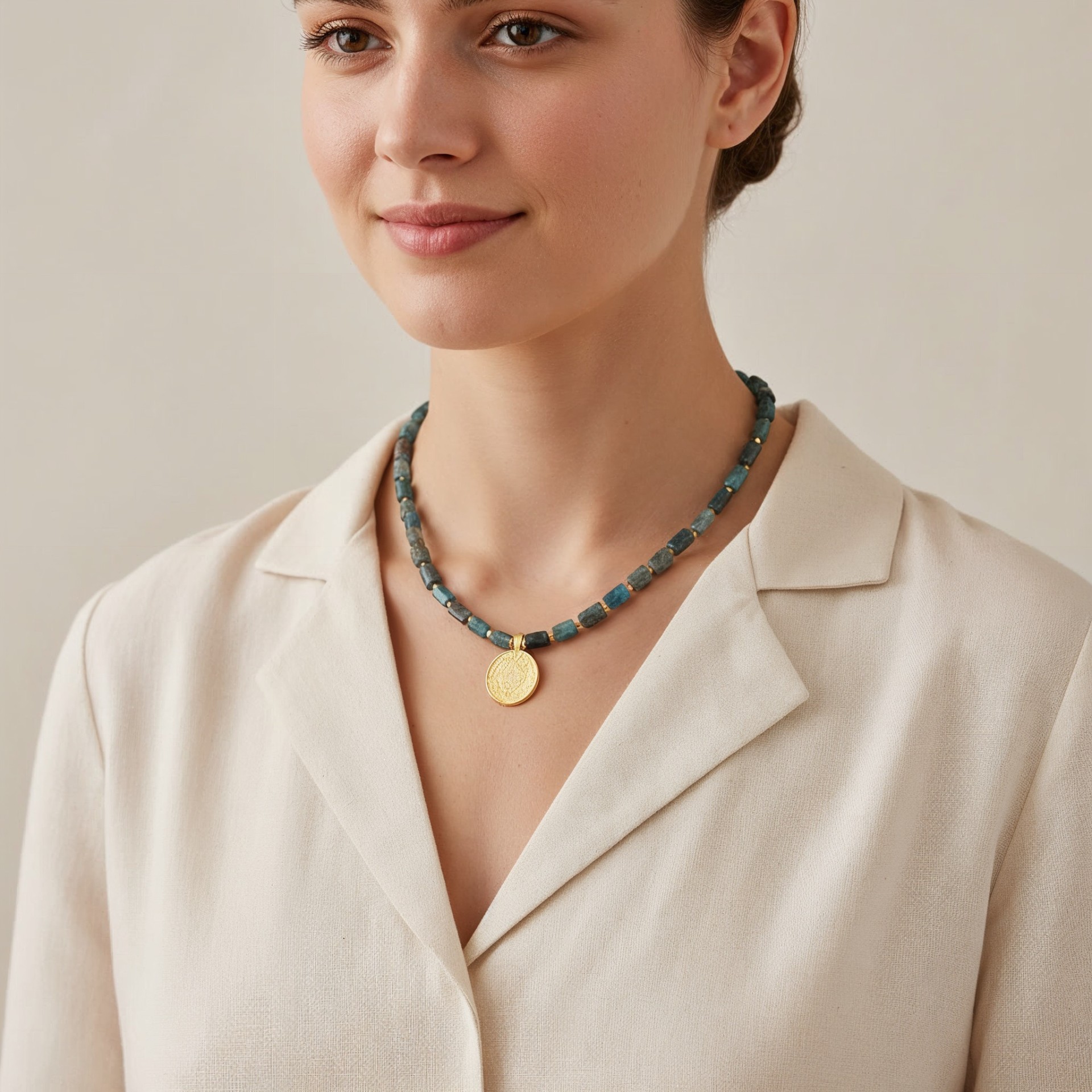 Apatitin ferahlatıcı mavi ışığı ve tılsım detayının nazik sembolizmi birleşerek günlük kullanıma uygun sade ama anlamlı bir şıklık sunar.