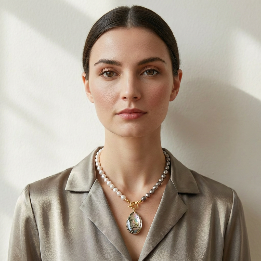 Sedef ışıltısı ve altın kaplama ara detaylar, kolyeye hem lüks hem de modern bir zarafet kazandırır.