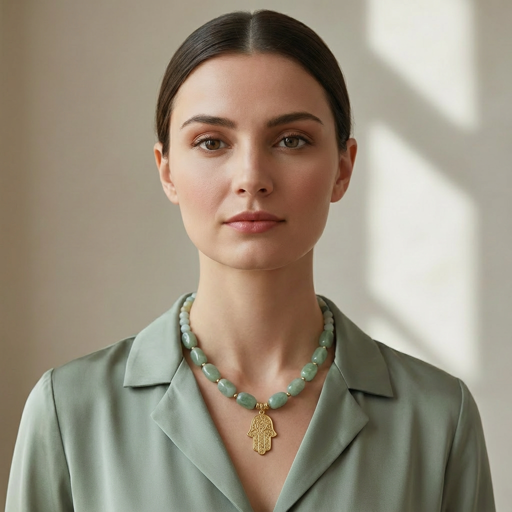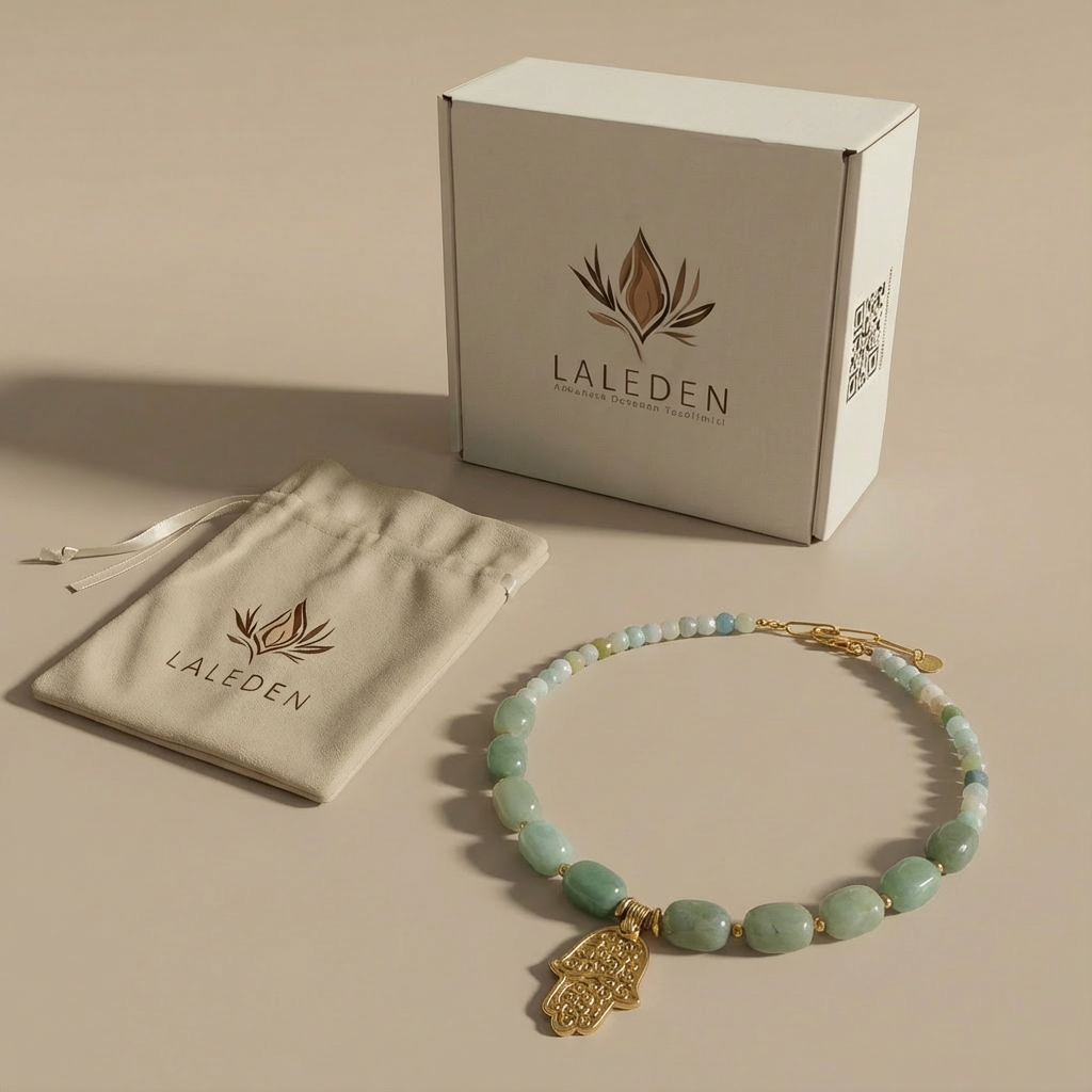 Aventurinin akışkan şansı, akuamarinin huzurlu berraklığı ve Fatma’nın Eli sembolünün koruma etkisi birleşerek güçlü ama yumuşak bir dengeleme alanı oluşturur.