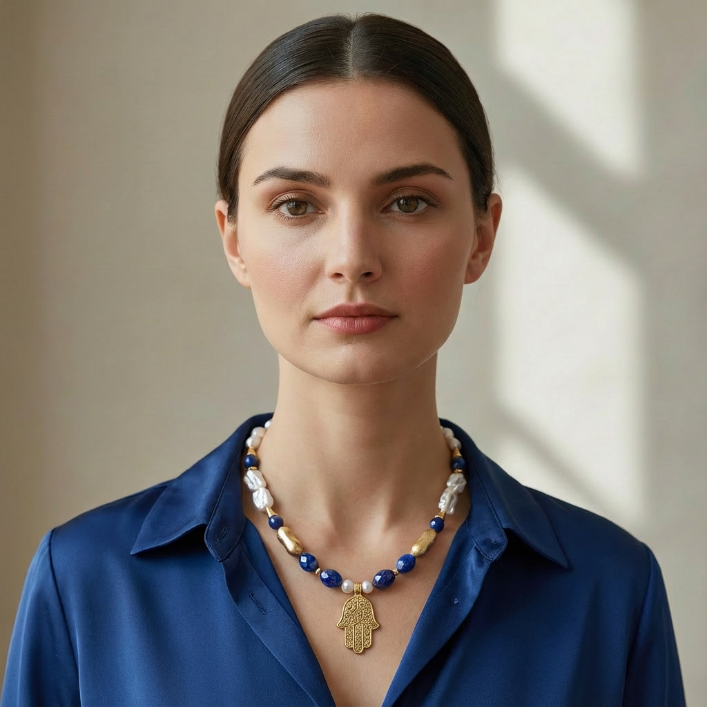 Fatma’nın Eli Detaylı İnci ve Lapis Lazuli Kolyesi, Laleden’in Koruyucu Enerji & Berrak Zihin kategorisinde Ultra Premium seviyesinde yer alır.