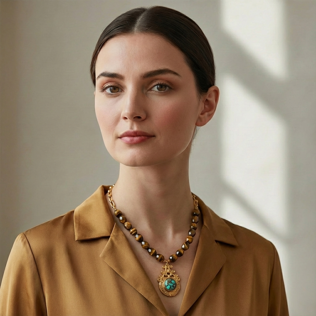 Bu özel tasarım, kaplan gözünün sıcak altın-kahve tonlarını turkuazın ferah mavi enerjisiyle bir araya getirir.