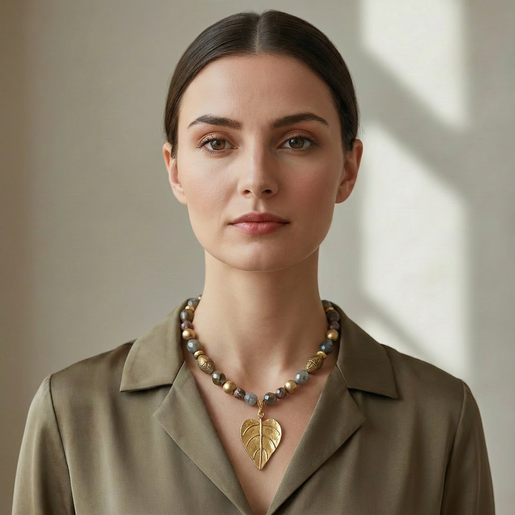 Gerçek labradorit taşının büyüleyici ışık oyunları, eskitme altın kaplama yaprak detayları ve Hayat Tohumu sembolüyle birleşerek benzersiz bir kadim zarafet oluşturur.
