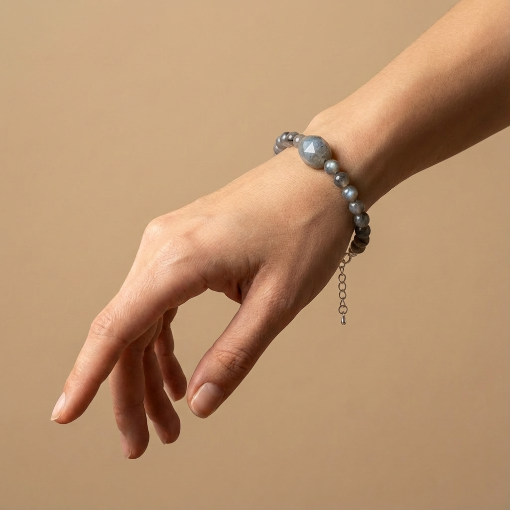 Merkezde konumlandırılan özel kesim labradorit taşı, bilekliğe hem enerjisel hem de görsel olarak güçlü bir karakter kazandırır.
