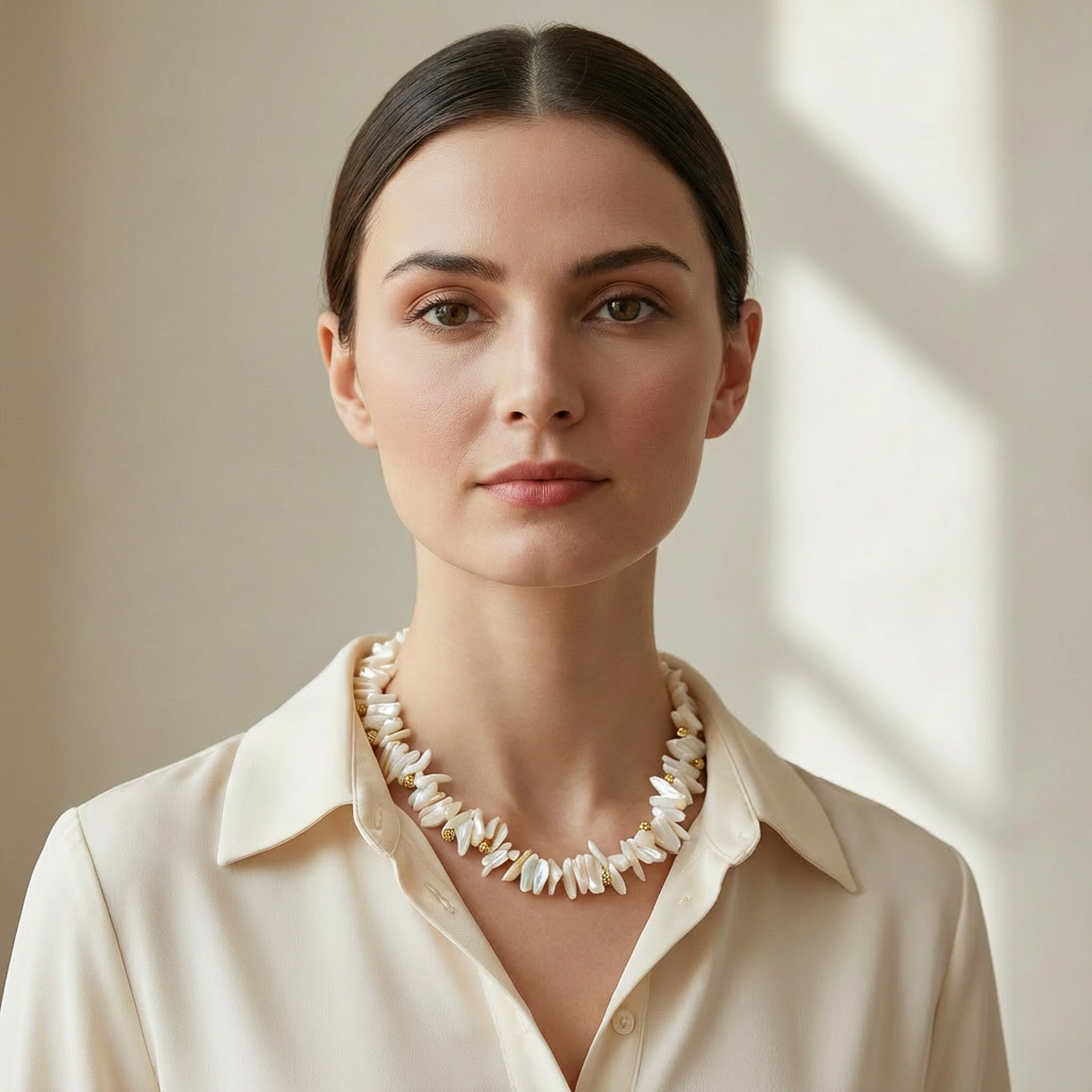 Sedefin sakin ve inci benzeri dokusu, kolyeye hem ferah hem de zarif bir ışık dengesi kazandırır.
