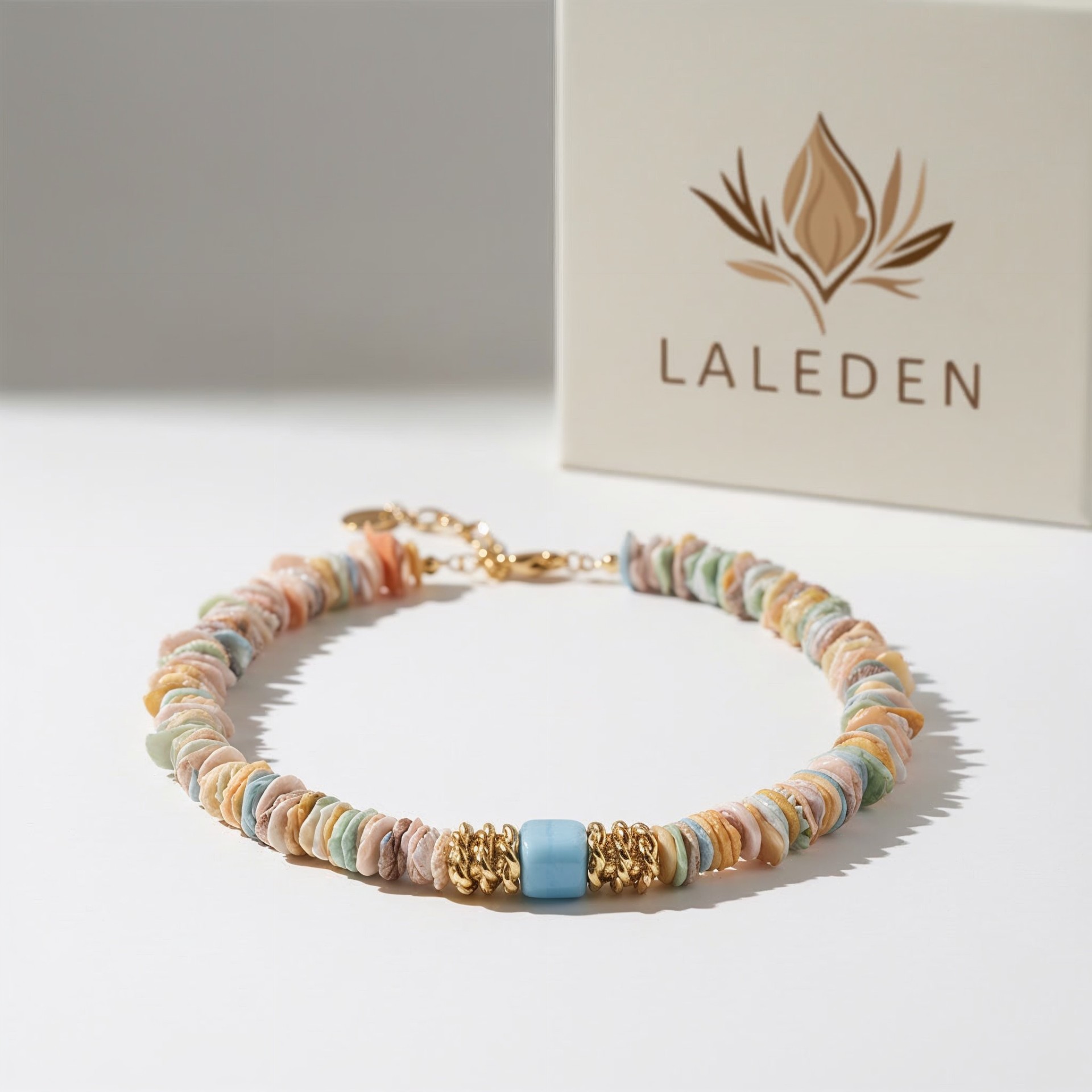 Bu özel tasarım, doğal sedef kesme taşların yumuşak parlaklığı ile altın kaplamanın sıcak ışıltısını bir araya getirir.