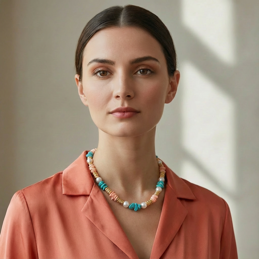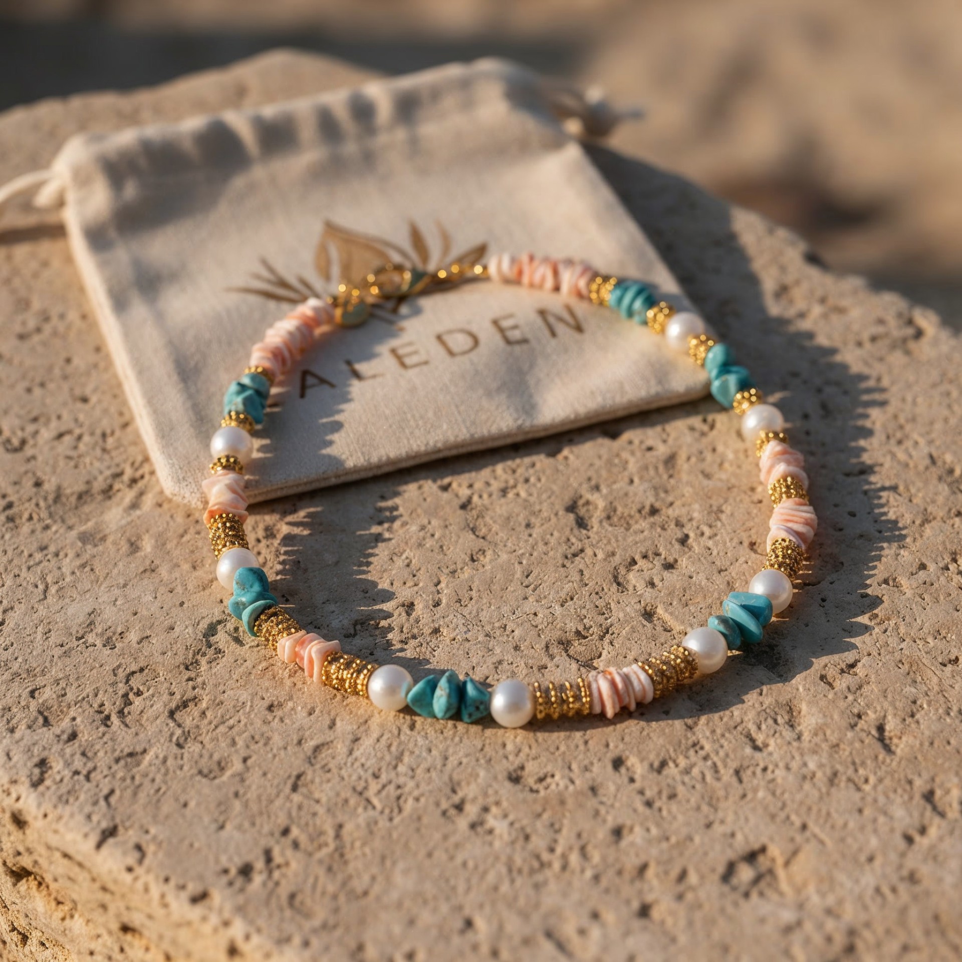 Sedefin sakinleştirici yapısı, turkuazın koruyucu enerjisi ve incinin yumuşak ışığı birleşerek hafif ama dengeli bir etki oluşturur.
