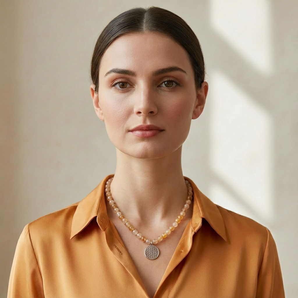 Sitrinin parlak ışığı ile yaşam çiçeğinin kadim düzen enerjisi birleşerek güçlü ve zarif bir bütünlük sunar.