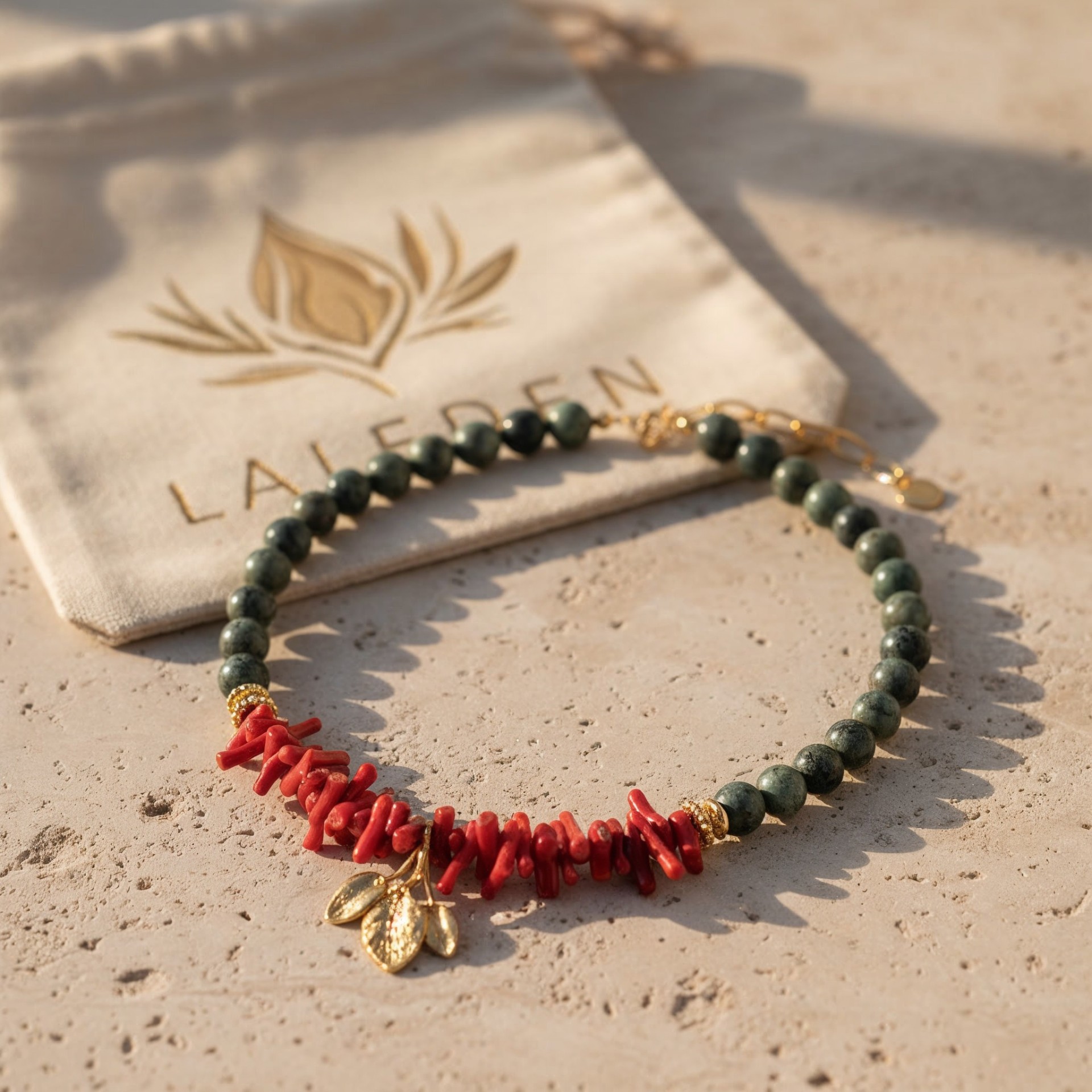 Afrika turkuazının dengeli frekansı kırmızı mercanın dinamik gücüyle birleşerek hem koruyucu hem de canlandırıcı bir etki oluşturur.