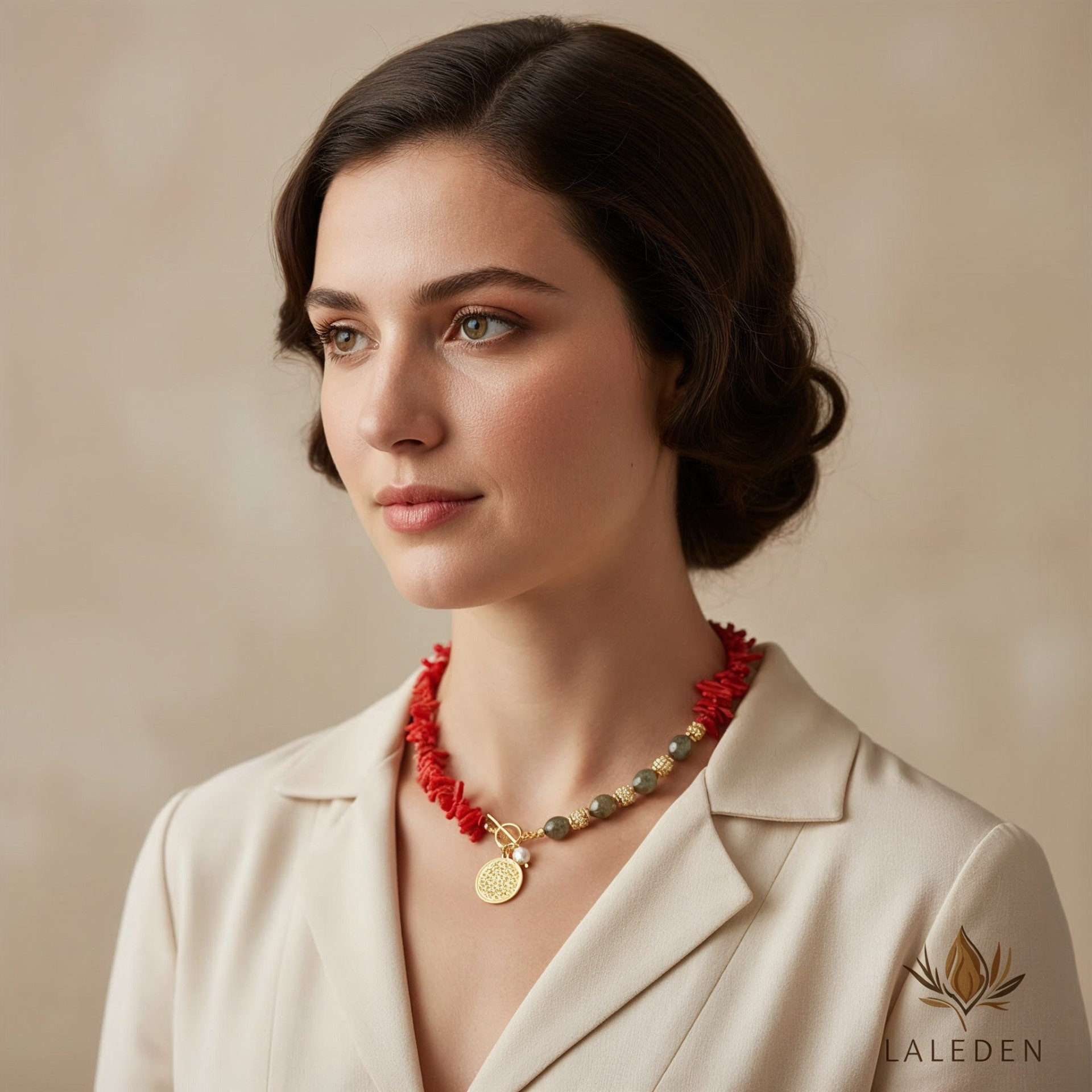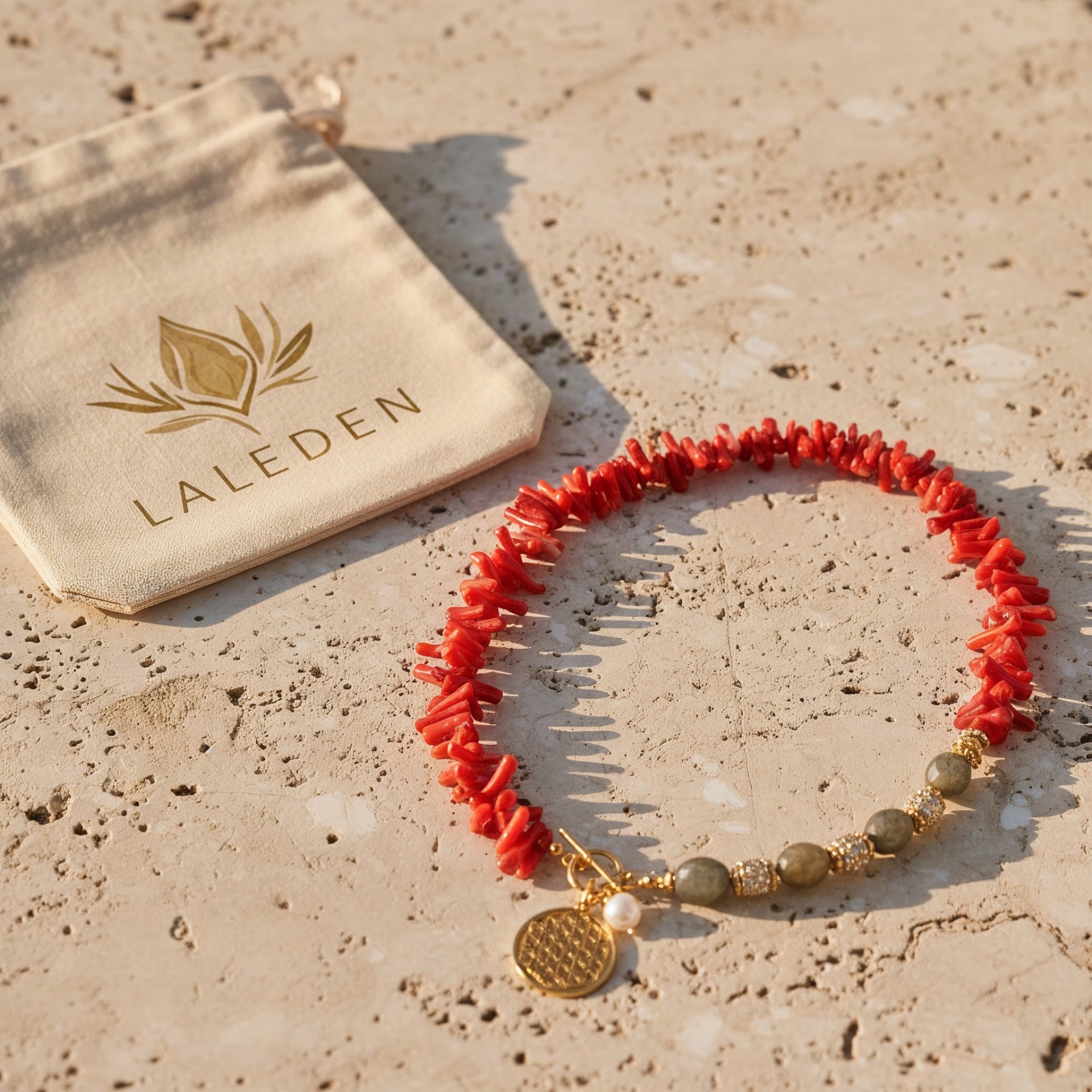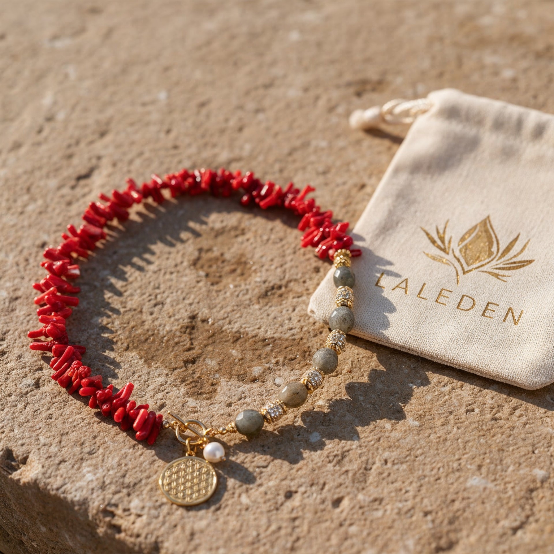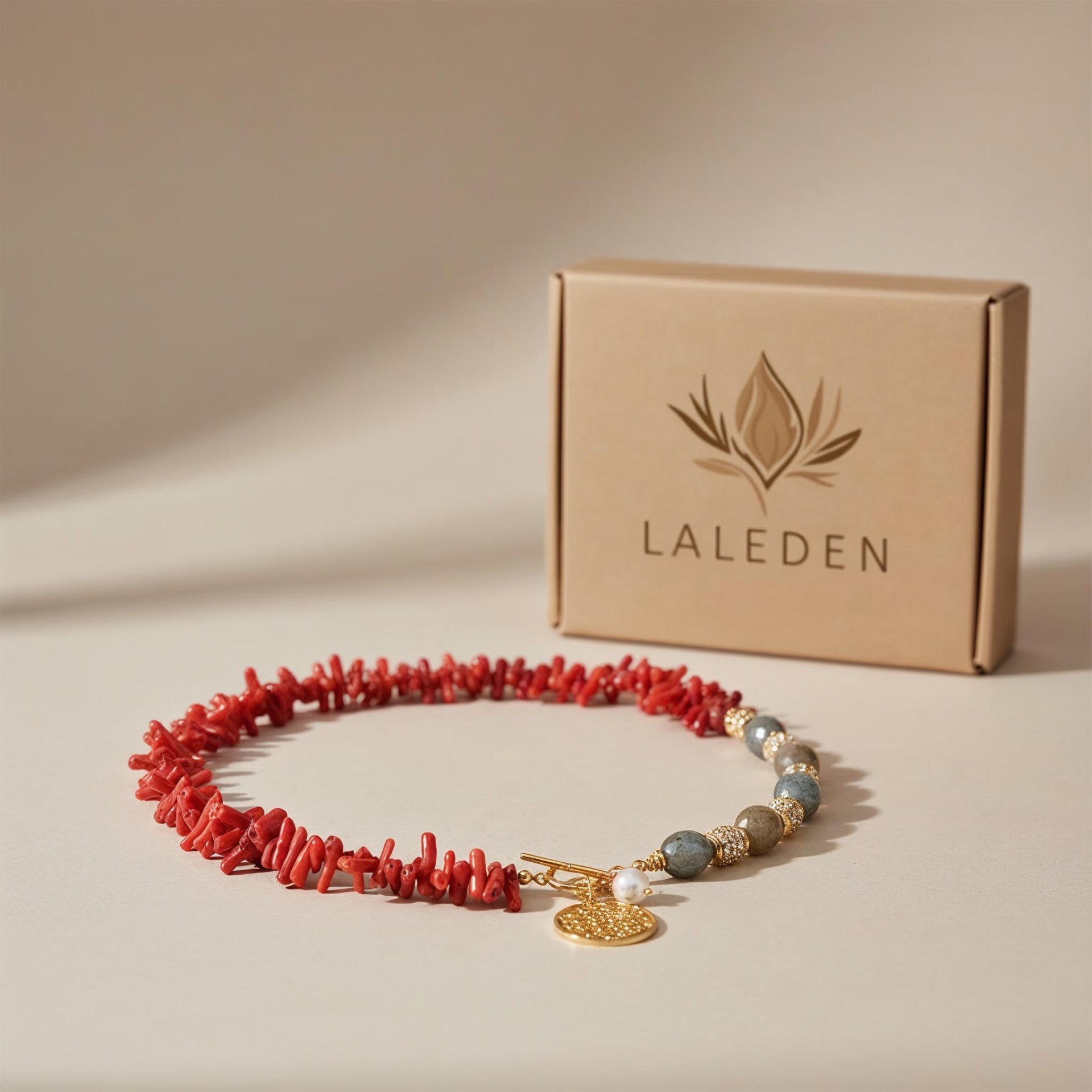 Bu özel tasarım, kırmızı mercanın güçlü enerjisini labradoritin mistik ışık oyunları ve incinin doğal parlaklığıyla bir araya getirir.