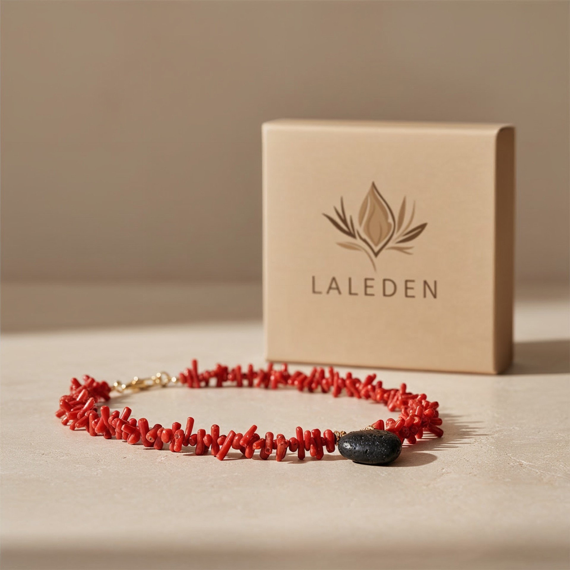 Bu özel tasarım, kırmızı mercanın canlı enerjisini lav taşının topraklayıcı gücüyle bir araya getirir.