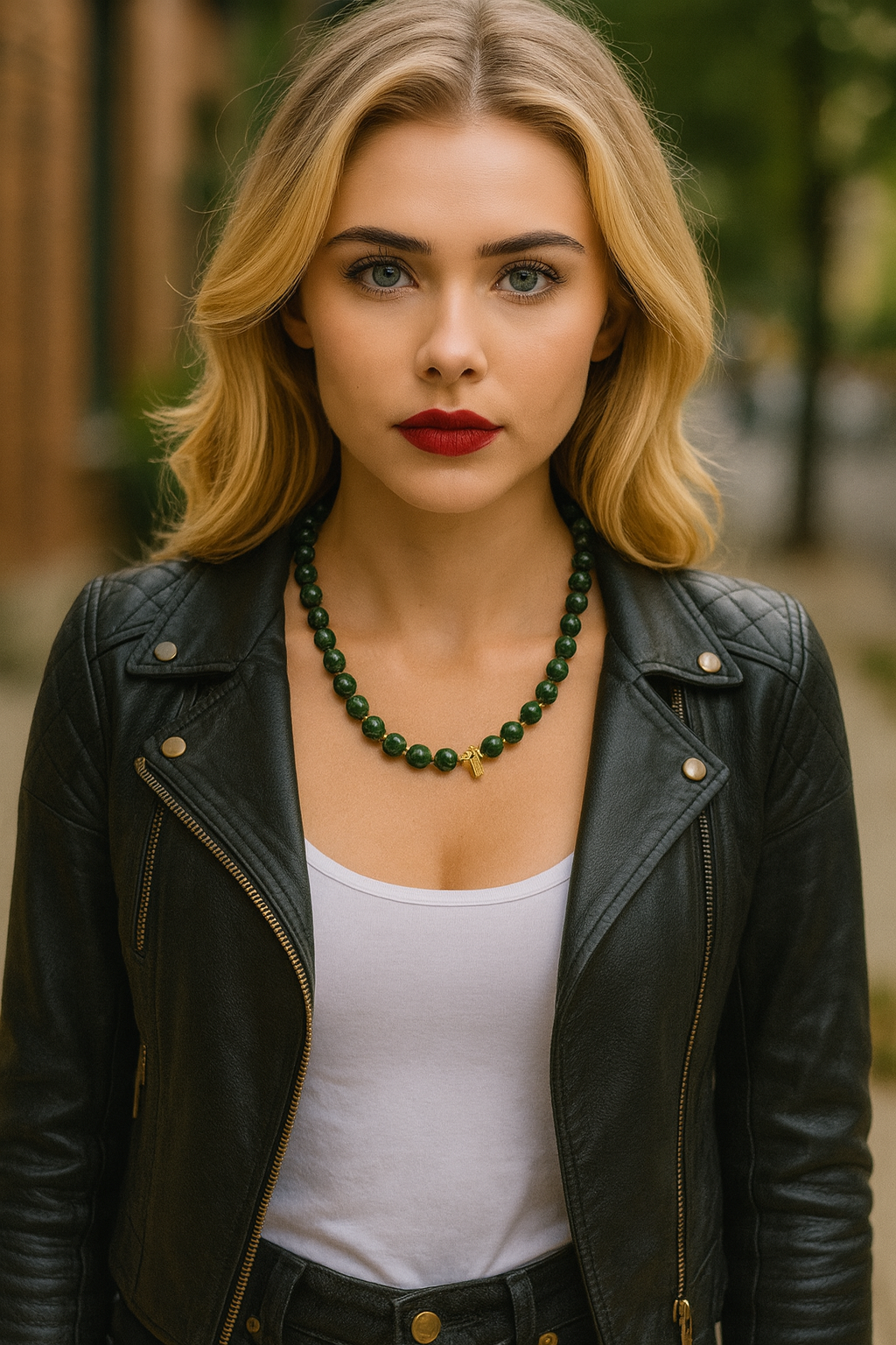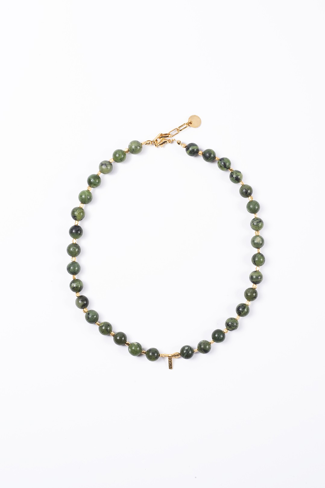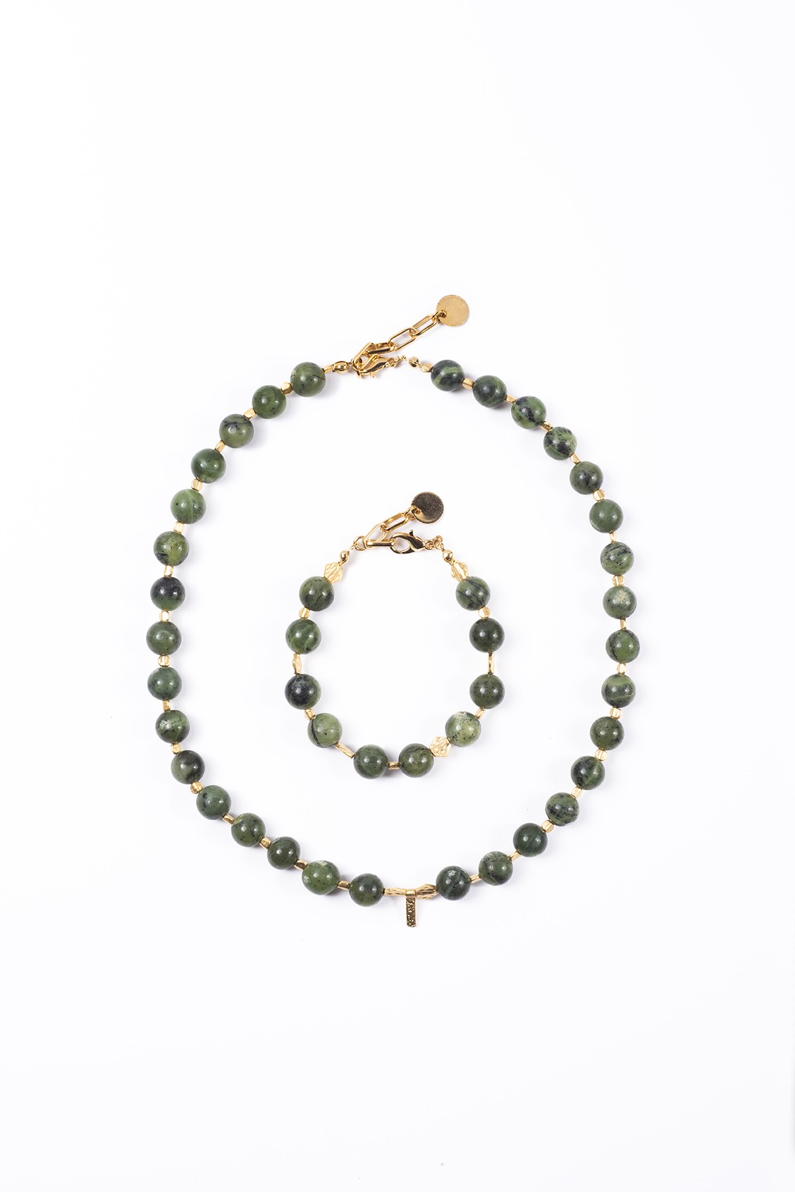 Şans, bolluk ve uyumun taşı yeşim, altın kaplama detaylarla birleşerek zarif bir tasarıma dönüştü. Doğal enerjisiyle ruhunuza denge katarken, şıklığınızı da öne çıkarır.