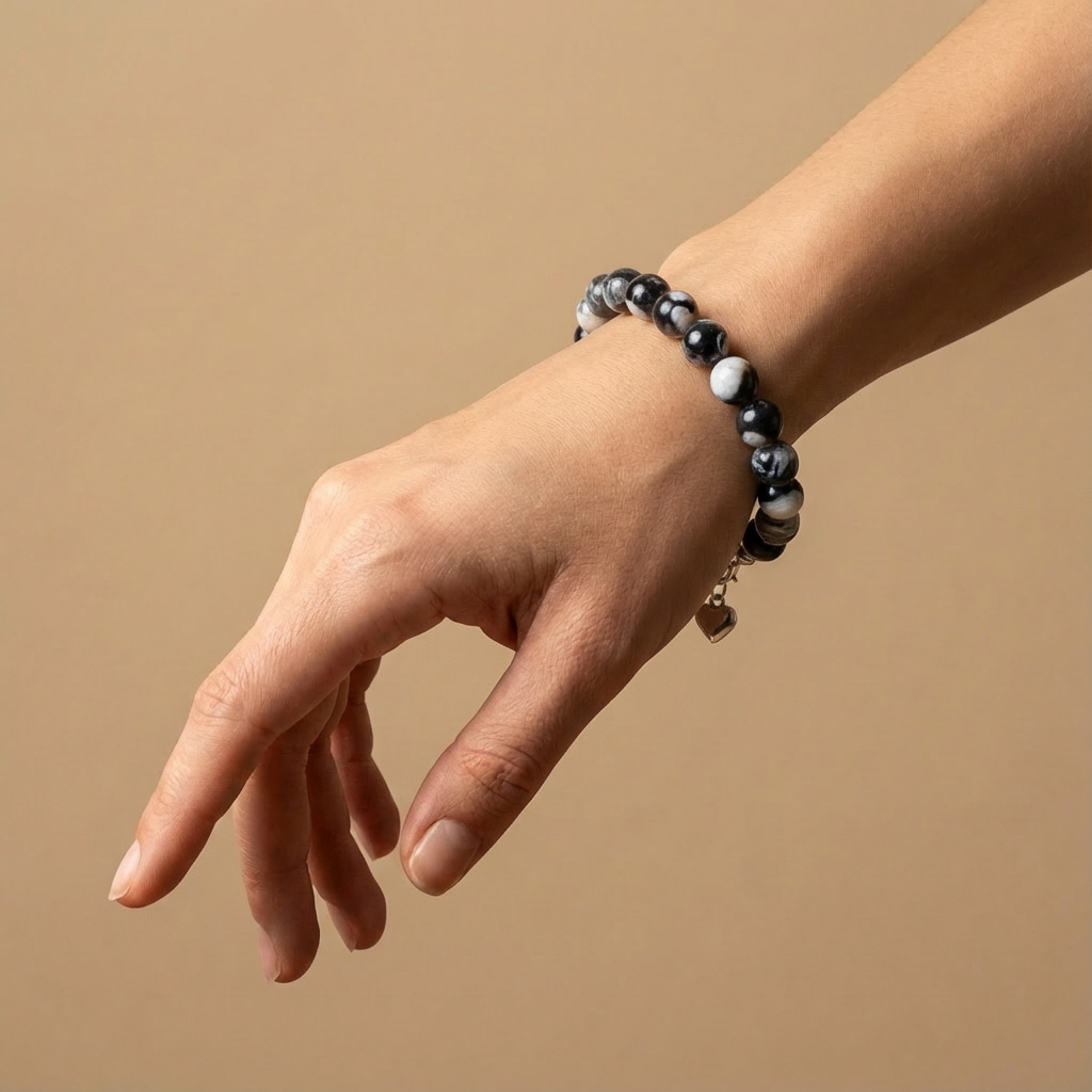 Zebra Jasper’ın net kontrastı, bilek üzerinde hem görsel hem enerjisel olarak güçlü bir ifade oluşturur.